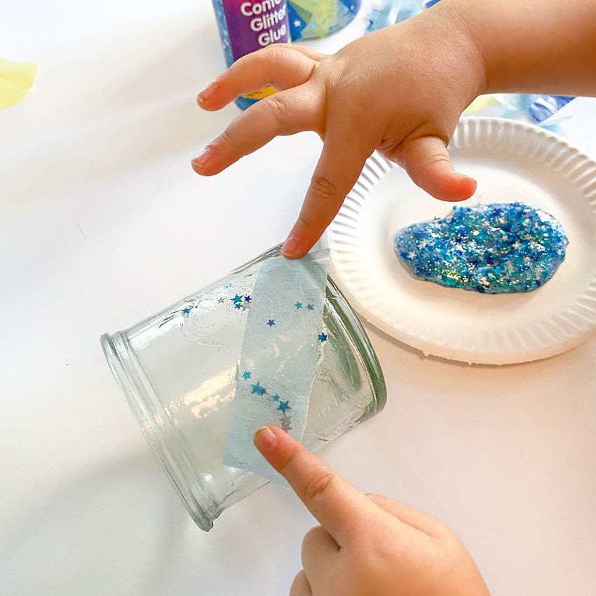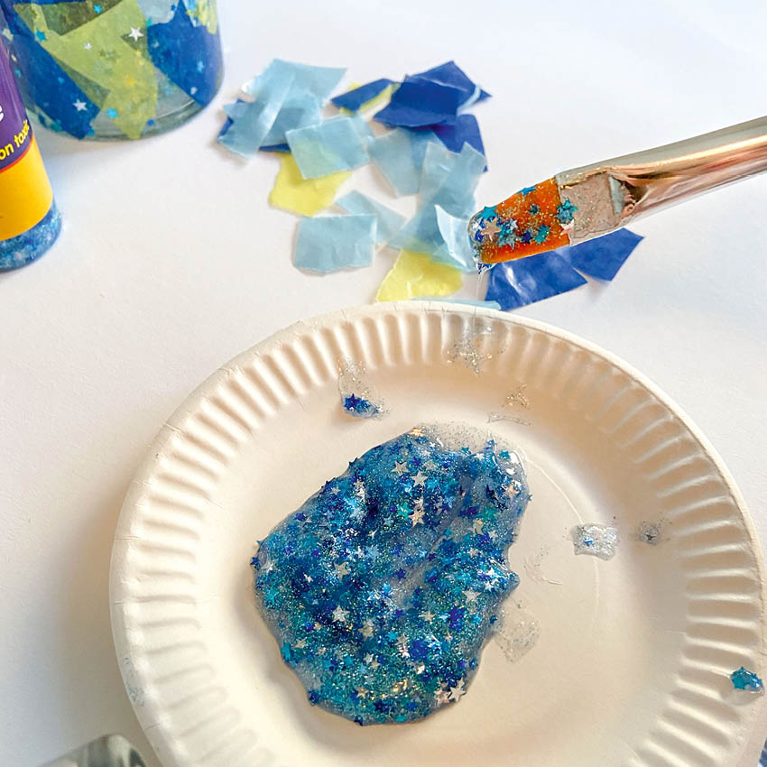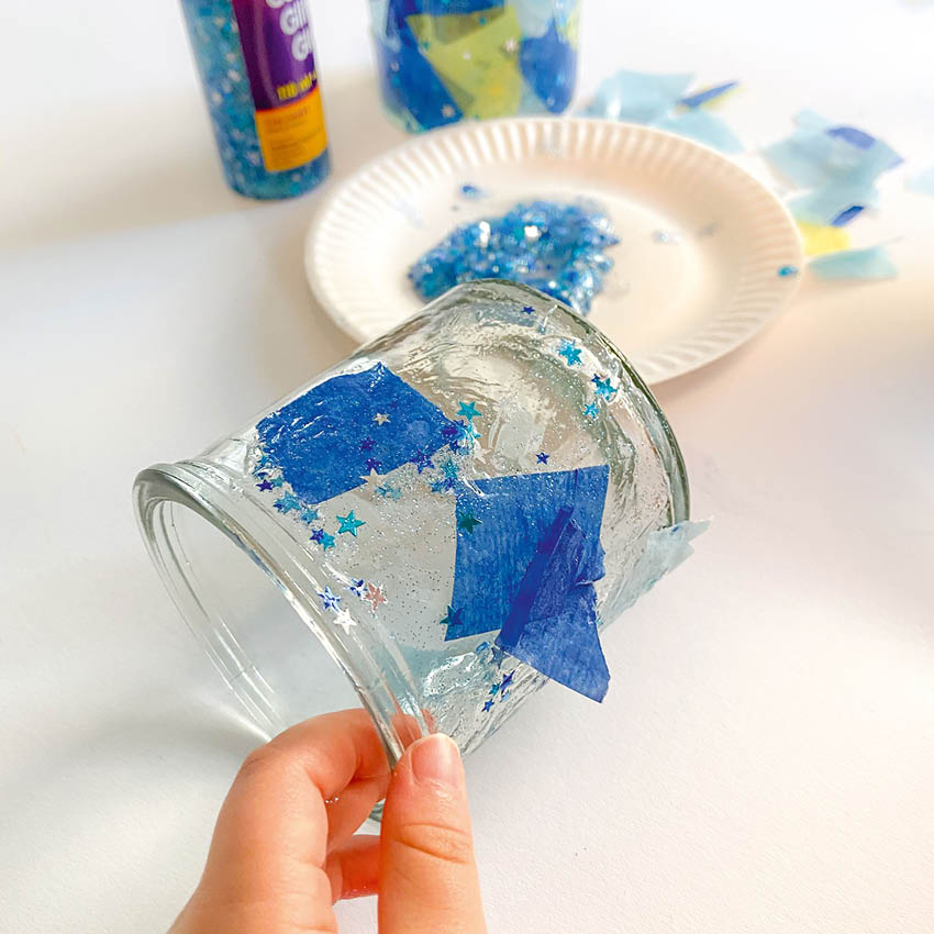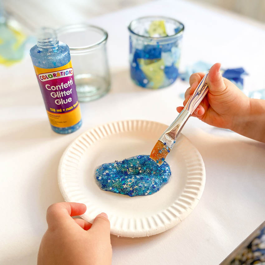 2. Pensle glasset med Confetti glitter lim med en pensel og fest på papirbitene etter ønske.